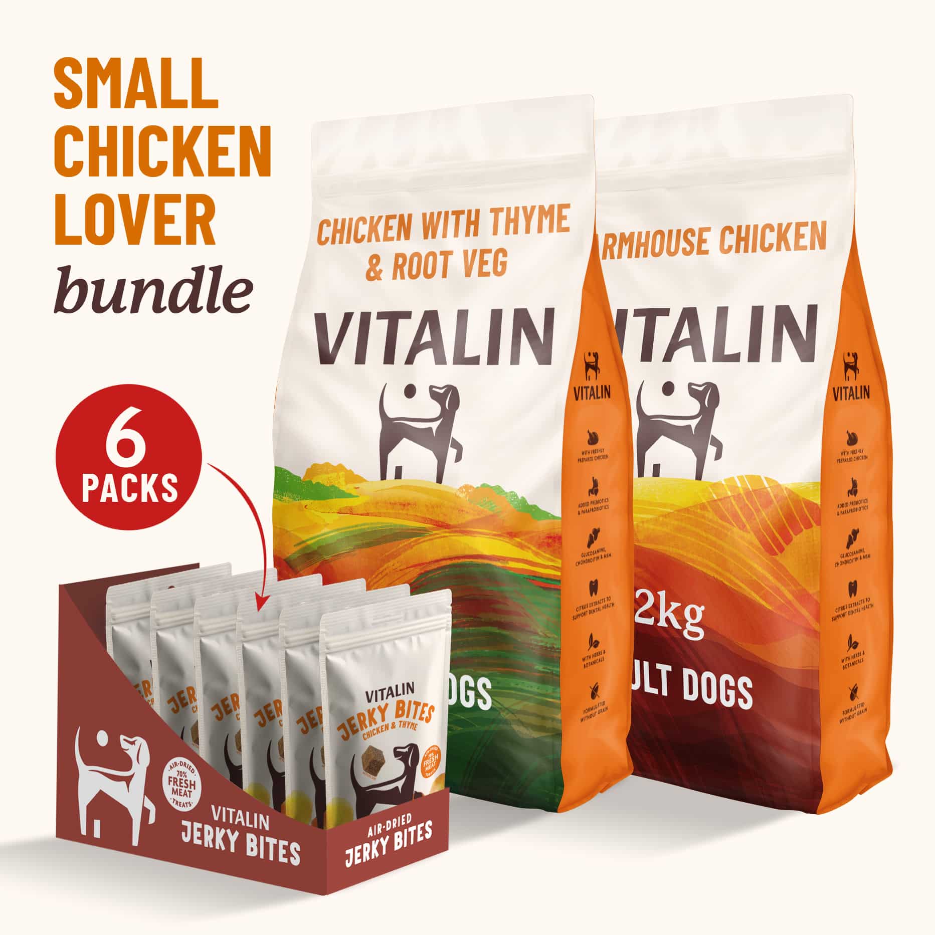 Our Chicken with Thyme & Root Veg recipe includes freshly prepared chicken, thyme, peas, potato, parsnip, carrot, and a tasty gravy. Added prebiotics & paraprobiotics help to support healthy gut function and glucosamine, chondroitin & MSM support joint health. Our Chicken with Thyme & Root Veg recipe contains citrus extract to help support dental health and is suitable for adult dogs of every age, including seniors. With recyclable packaging and our handy reseal, the last bowl will be as fresh as the first, delivering holistic vitality from farm to tail.